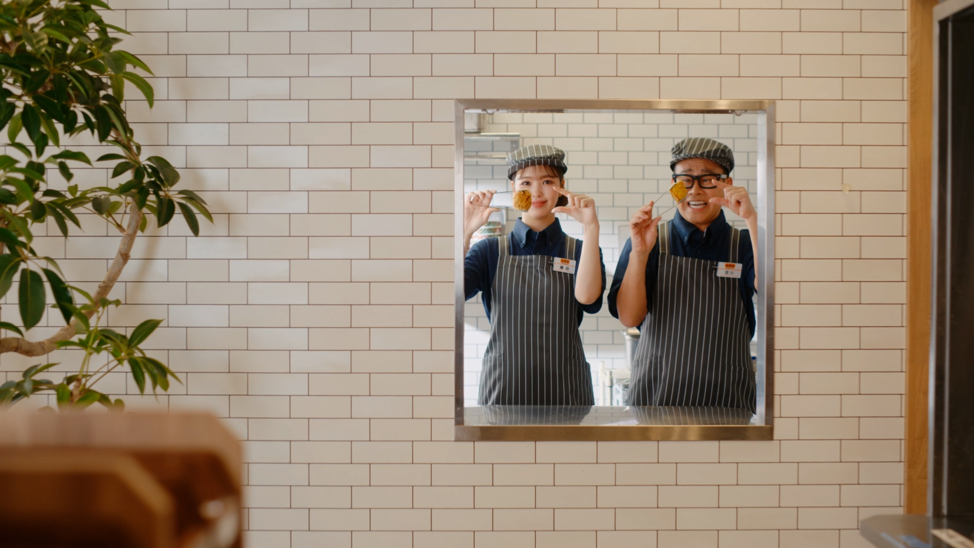 トングでから揚げを持って、指でサイズ確認する、お馴染みになりつつあるポーズを今年は宮川店長もチャレンジ。