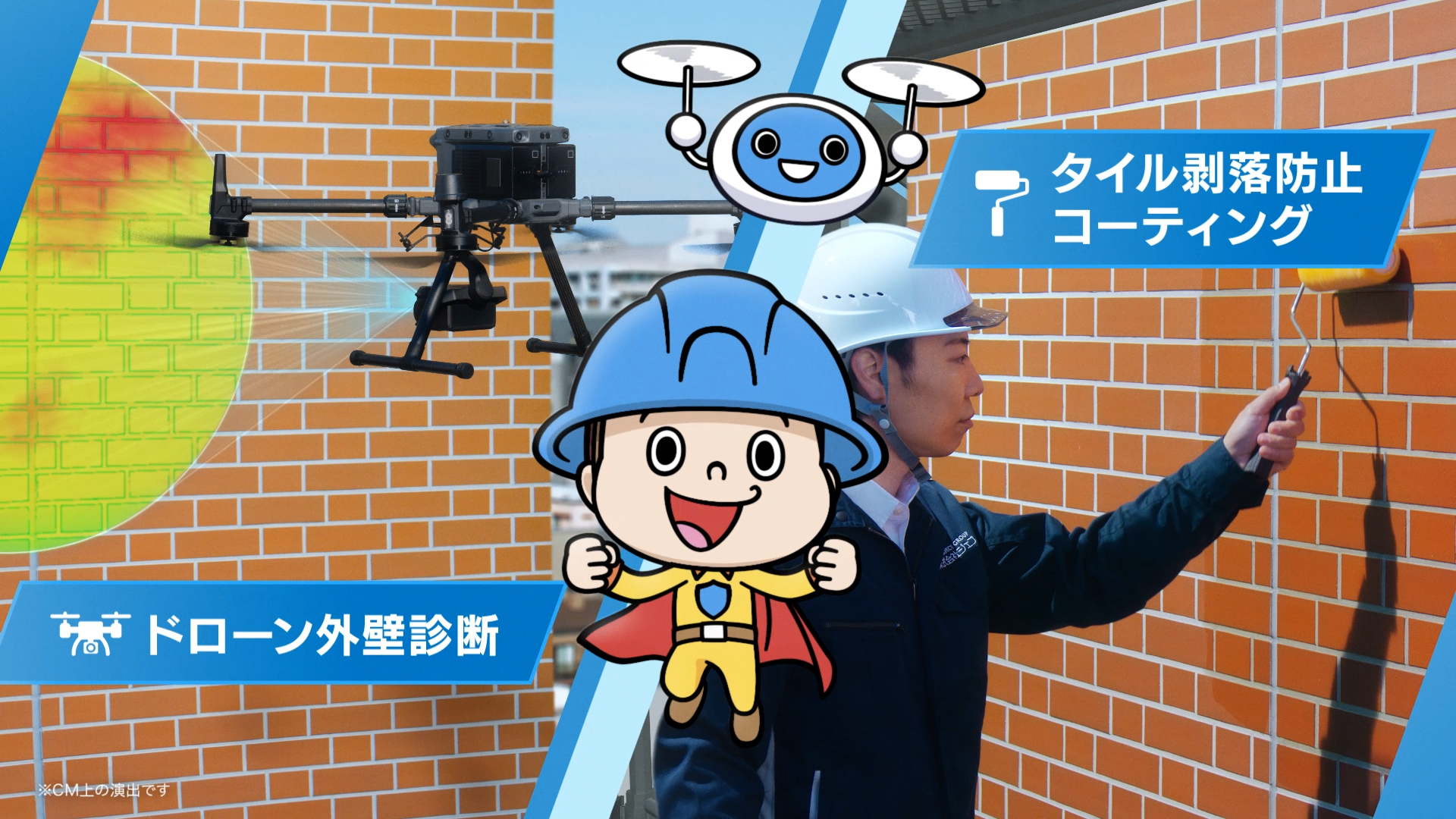 「ビルの外壁タイルは意外と落下する」という恐い事故を防ぐため、剥落防止くんが大活躍。