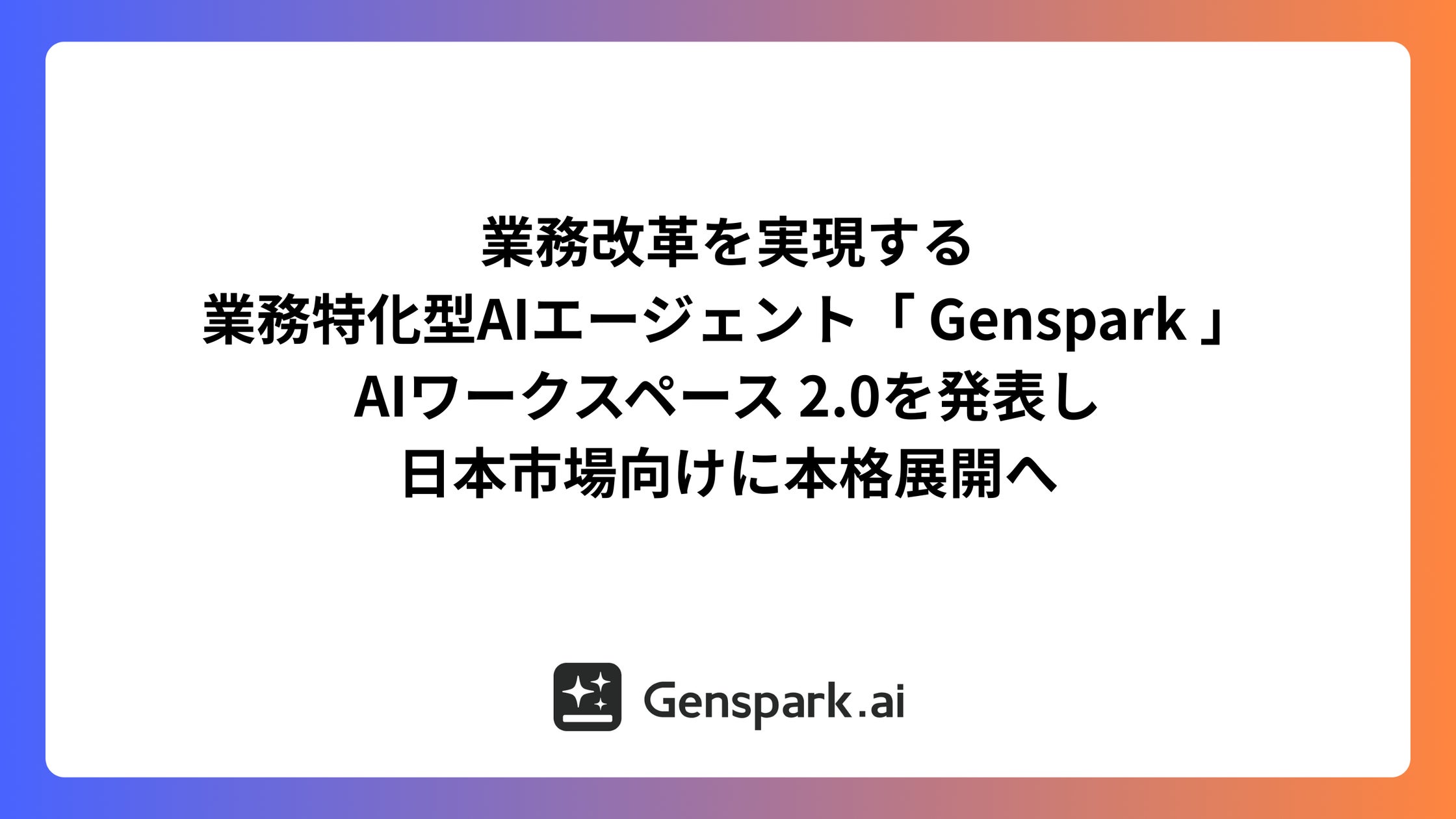 シリコンバレー発の次世代オールインワン AI ワークスペース「Genspark」は、ホワイトカラーの業務効率化に貢献する新機能を一気に拡充するAIワークスペース 2.0を発表し、日本での法人展開を本格化することを発表。