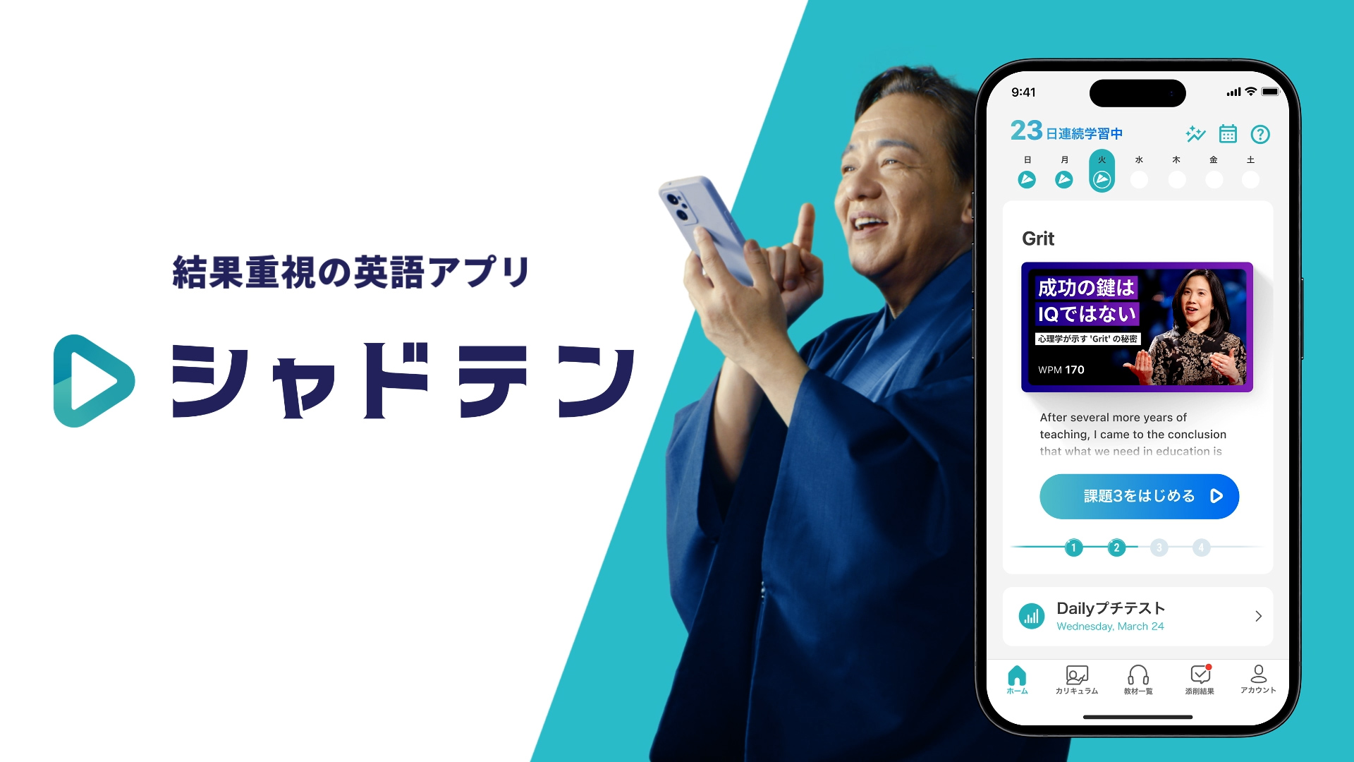 シャドテンは、英語の音声を数語遅れてそっくりそのまま発話するシャドーイングに特化した英語学習アプリです。レベルや目的に合わせた課題に1日30分程度取り組み、録音・提出された音声を英語のプロフェッショナルが毎日添削。初級者から上級者まで効率よくリスニング力を強化できます。